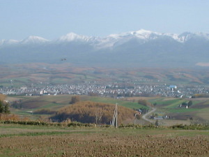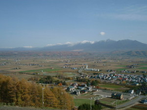 | 奈江から千望峠に上る道道。からまつが黄金色になり,太陽に映えています。 | 千望峠から上富良野市街と十勝岳連邦を望む定番の写真。北海道の観光パンフレットなどで見たことはありませんか? |