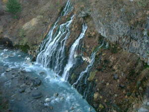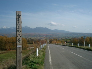 | 白金温泉にあります。白ひげの滝。昭和63年の十勝岳噴火の後に架けられた避難橋から見ることができるようになった新名所です。知名度はまだ低いですが,青い水が岩壁から噴出している滝は全国に誇れる奇観です。 | 十勝岳火山情報センターに行く道。右は白金模範牧場。いつもはホルスタインが群れていてもっと絵になるのですが。白金に行く際には望岳台だけではなく,こういった穴場も訪れてもてください。 |