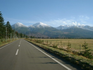 | 中富良野町北星山からの十勝岳連峰眺望。目の前にはラベンダー畑が広がり,眼下に中富良野市街があります。富良野線を走る1両編成の列車がミニチュアのようです。 | 最近「上富良野八景」に指定された「パノラマロード江花」。一直線の道路の向こうは穀倉地帯の富良野盆地です。私が実家に帰ったとき,自転車でよく来るところです。 |