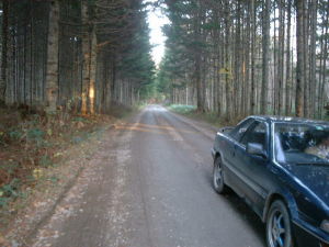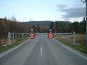 | 珍名峠「西瓜峠」。美瑛,上富良野から南富良野方面への近道です。ごらんのとおり砂利道にしてはよい道で,地元の人はよく利用します。ただし,友人がここで熊を見たといっていました。冬季は通行止めになります。右は友人R氏の愛車。 | 何とか日が暮れる前に幾寅峠を越えられそうです。と思ったら,すでに冬季通行止めに入っていました。ちょっと早くないか。 |