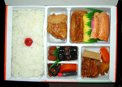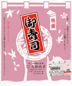 特選御寿司,400円,2001.1.6購入 ★★★★コンビニの助六寿司と変わらぬ値段ながら,本職の弁当屋が調整しているだけあって格段においしい。 |