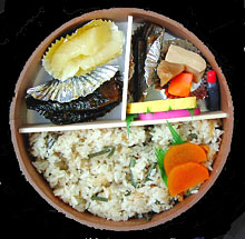 すずらん番屋めし,700円,2002.2.11購入 ★★★★容器の半分を占める炊き込み御飯はボリュームたっぷり。メインはニシンの煮付け。それと数の子がごろん,ごろんと入っている。その素朴な盛り付け具合には,番屋の豪放な気風が感じられる。値段も700円と安い。 |