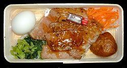 ふらのとんとろ丼,980円,2003.8.10購入 ★★★★豚の産地,富良野らしい駅弁。半熟卵を載せて食べる。本当は生卵にしたかったのだろうが,汽車の中で生卵を割ってひっくり返すと手に負えなくなるので半熟にしたのだろう。小瓶にはコチュジャンソースが入っているが,これは何につけるのだろうか。容器が本物の木であるというのは嬉しい。 |