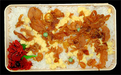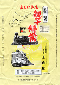 親子辯當,630円,2002.3.21購入 ★★★★見本の写真に比べるとずいぶん具が少なかった。しかしたった1個のために駅弁屋さんが駅まで届けてくれたのだからありがたいと思わなければならない。ご飯の量はたっぷりあり,お腹は十分に膨らむ。列車に乗ってから食べようと思ったが,木製の容器が見る見るうちに変形して手に負えなくなったので,慌てて食べた。古めかしい包装紙といい良い味出しており,いつまでも残ってほしい駅弁だ。 |
