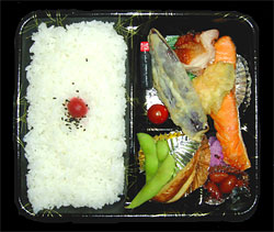 豚どん,1100円,2001.8.19購入 ★包装紙になにやら細かい説明が書かれている。この時点で失格。弁当を食べる前に説明書きを読む人などこの世の中にどれくらいいるだろうか(ちなみに私はきちんと読む性格だが)。つまり,ヒモを引っ張ると容器の底に入っている発熱体が発熱してアツアツの弁当が食べられるということが書いてあるのだが,それを知らずに食べてしまう人がけっこういると思う。実際見たことがある。知らないで食べてしまった人にとっては単に上げ底をした詐欺弁当である。 |