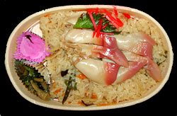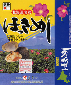ほっきめし,890円,2002.3.23購入 ★★★★★苫小牧はホッキ貝水揚げ日本一だそう。プリプリしたホッキは意外に柔らかく絶品。山菜たっぷりの炊き込みご飯が嬉しい。 |