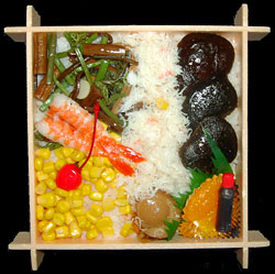 えぞずし,660円,2002.12.28購入 ★★★★大きなしいたけ,たっぷり入ったカニ,これで660円はあまりにも安い。小瓶のしょうゆも入っているが,特に使わなくても,さっぱりとおいしく食べられる。ただ,容器の底にフィルムが敷いてあり,これが滑って食べづらい。 |