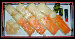 サーモン寿司,700円,2001.9.25購入 ★★★★★まるいの主力商品。スモークサーモンの押し寿司で,さっぱりしていておいしい。意外とおなかも膨らむ。 |