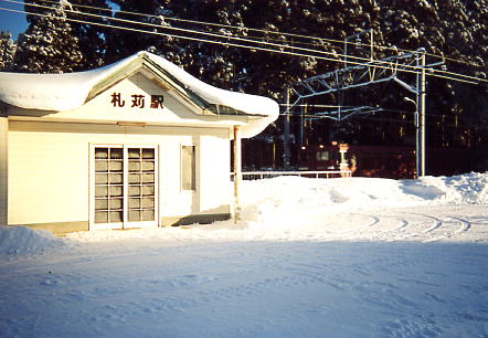 駅舎は昭和63年の建物。海峡線開通時に交換駅となった。周辺は林に囲まれ,林の中から列車が顔を見せる雰囲気はなかなかよい。沿線の中では雪が多いところ。待合室にはストーブがある。