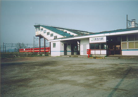 昭和39年建築の駅舎。この時代特有の平べったい鉄筋コンクリートの建物で,冷たい感じがする。1997年無人化。ホームは駅舎側から4番,3番,2番。2番,3番の島式ホームが本線用で,4番は1日1本,旭川行の2番列車が特急待避のために使用する(2002年1月現在)。隣接して日本石油の油槽所があり,いつもタキ車が多数停まっている。
