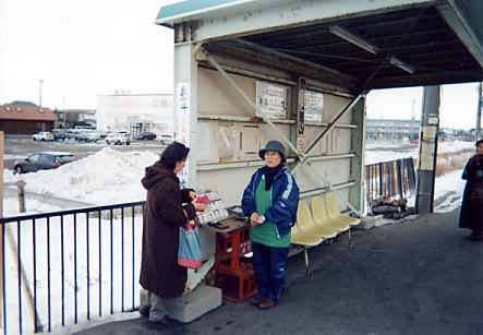この駅で委託で切符を売っているおばさんは元気だ。駅の待合室にも窓口があり,一見普通の駅のように思うが,苫小牧行の列車が来る時間になると「乗車券は下りホームで販売しています」という札を立て掛けて,切符の販売道具を一式かついで下りホームに出かけて行く。その販売風景は下の写真のとおり。ビール箱を重ねて,その上に乗車券一式と計算機を置いている。切符は風で飛ばないように,バンドで行き先別にとめてある。このような素朴な切符の販売風景が見られるのは全国でもここだけではないだろうか。