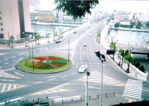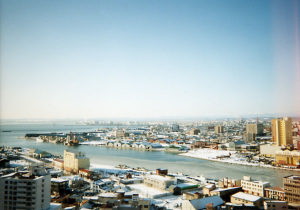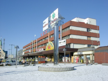 駅の左前方に徒歩15分。北海道三大名橋の一つ。昭和51年完成の5代目の現橋は四季の像で全国に知られている。(H11.1通過)